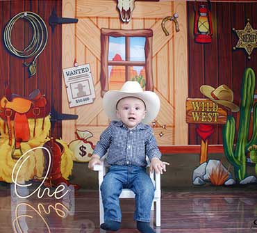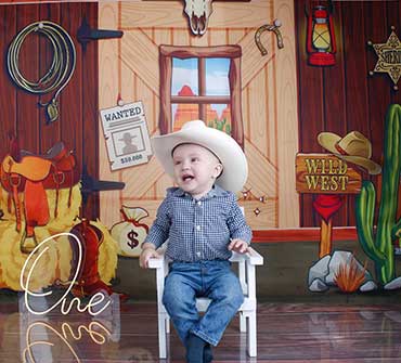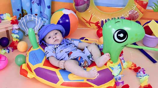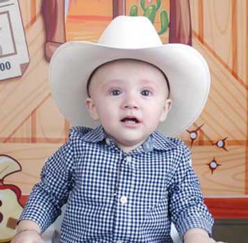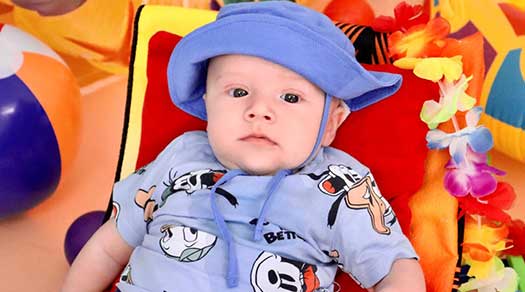 Ahora de algunos meses, mira fijamente a la cámara con una expresión de asombro y curiosidad. Viste un adorable atuendo azul, complementado con un pequeño sombrerito que le da un aire encantador.