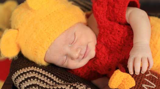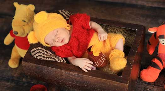 En la primera foto, el bebé tiene solo unos días de nacido, envuelto en la dulzura de la infancia y vestido con un adorable disfraz de Winnie Pooh.
